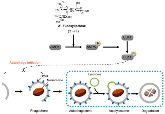 Human milk oligosaccharide 2′-fucosyllactose (2′-FL) promotes melanin degradation via the autophagic AMPK–ULK1 signaling axis. 2′-FL activates AMPK, which, in turn, phosphorylates ULK1 at Ser555 and inhibits Ser757-mediated inactivation, with consequent autophagy initiation (reproduced with permission from [89]).