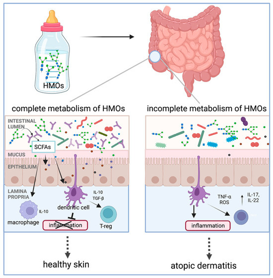 Metabolism of human milk oligosaccharide (HMO)-induced immunological effects and protection of skin from atopic dermatitis development (reproduced with permission from [17]). Notes: SCFAs: short-chain fatty acids; IL: interleukin; TGF-β: transforming growth factor-β; T-reg: regulatory T cells; TNF-α: tumor necrosis factor α; ROS: reactive oxygen species.