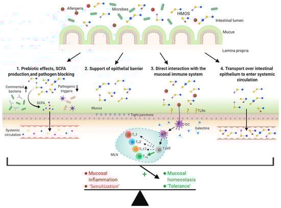 Allergic diseases, such as respiratory allergies, food allergies, and atopic dermatitis, have shown increasing prevalence, particularly among children and infants, which has triggered interest in dietary intervention in early life to modulate gut and immune maturation. HMOs have been shown to exhibit effects in the modulation of the gut microbiome [33,52] and mucosal immune response, which play a potential role in the prevention of allergic diseases [17]. Zuurveld et al. summarized the possible functions of HMOs related to the protection of allergic diseases at a young age (Figure 10) [122]. First, HMOs act as prebiotics by promoting commensal bacteria growth and inhibiting pathogen adhesion to the intestinal epithelium. HMO fermentation to SCFAs strengthens epithelial barrier function and modulates immune responses locally and systemically. Second, HMOs boost mucus secretion and tight junction integrity, reinforcing the physical barrier between the intestinal epithelium and the gut content. Thirdly, HMOs directly regulate immune function by influencing the dendritic cell response. Finally, a small fraction of HMOs transported over the intestinal epithelium exert immunomodulatory effects beyond the gut. These HMO-mediated mechanisms may promote immune tolerance and, therefore, potentially prevent allergic diseases.