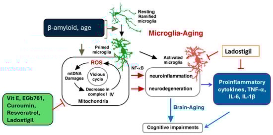- Wong, W.T. Microglial aging in the healthy CNS: Phenotypes, drivers, and rejuvenation. Front. Cell. Neurosci. 2013, 7, 22. [Google Scholar] [CrossRef]