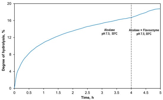 Alcalase is a commercial preparation derived from Bacillus licheniformis, with subtilisin as its main enzymatic component. Subtilisin is a broad-spectrum serine endoprotease that preferentially cleaves peptide bonds with hydrophobic and aromatic residues. It exhibits maximal proteolytic activity at alkaline pH (8–9) and at temperatures ranging from 50 to 60 °C [,]. Due to its broad specificity and high proteolytic activity within the experimental conditions (pH 7.5 and 55 °C), it is expected that the extent of hydrolysis is primarily determined by the Alcalase treatment. In contrast, Flavourzyme is a commercial enzymatic cocktail, derived from Aspergillus oryzae, mostly composed of amino- and dipeptidases. According to Merz et al. [], Flavourzyme shows optimal peptidase activity at near-neutral pH (6–7) and temperatures in the range 55–65 °C.