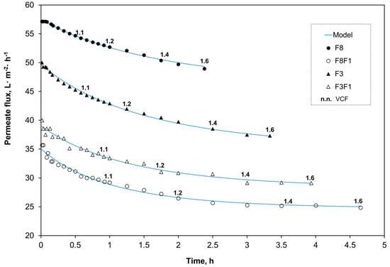 Evolution of the permeate flux (L·m−2 membrane·h−1) as a function of the operation time (h) and the volume concentration factor (VCF). The blue solid curves represent the permeate flux predicted by the dynamic resistance-in-series model (Equation (5)). F8, F3: permeate streams from the 8 and 3 kDa MWCO membranes, respectively. F8F1, F3F1: permeate streams obtained after filtration through 1 kDa of F8 and F3, respectively.