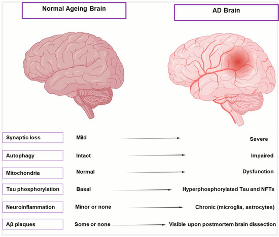 The term “healthy brain aging” describes aberrant aging characteristics within the body’s manageable range and does not have detrimental effects. On the other hand, “pathological brain aging” describes the occurrence of aberrant aging characteristics outside of the body’s controllable range. In addition to aging, the abnormal buildup of amyloid beta (Aβ) or neurofibrillary tangles (NFTs) in the brain causes the transition from early (prodromal) to established AD. Numerous brain cell types in AD patients and experimental models have shown signs of cellular senescence, which builds up and causes neurodegeneration and age-related disorders [4]. Removing senescent cells and other signs of aging may improve cognition and reduces tau- and Aβ-induced neuropathology in AD rats [5,6,7], indicating that aging is a key risk factor in the pathophysiology of AD. Nevertheless, much more needs to be explored about the neuro-pathophysiological function of aging and its underlying mechanisms in AD. Researchers are working to advance the therapeutic options for this disease [8,9,10].