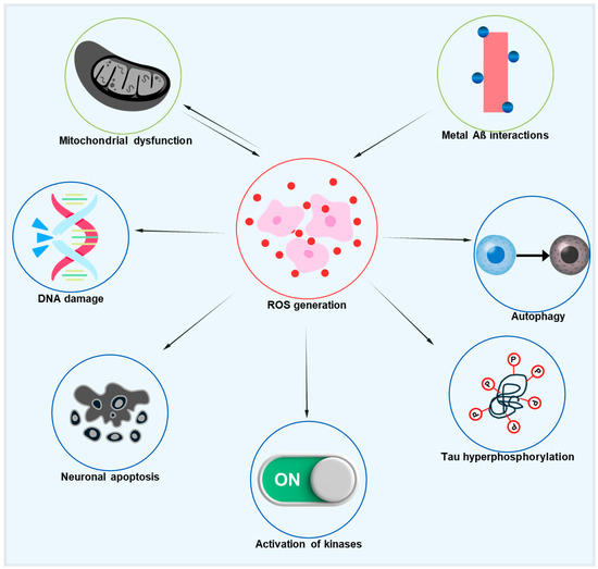 Diagrammatic illustration of the pathogenic cascades in AD initiated by ROS. Excessive ROS production, driven by mitochondrial dysfunction and metal–Aβ interactions, leads to DNA damage, impaired autophagy, tau hyperphosphorylation, the activation of pro-pathogenic kinases, and neuronal apoptosis. Notably, a reciprocal link between mitochondrial dysfunction and ROS generation creates a vicious cycle that accelerates neurodegeneration.