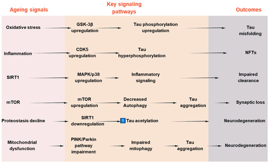 Signaling pathways involved in tau pathologies and aging-associated neurodegeneration.