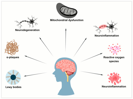 Given its significant impact on life expectancy and quality of life, neurodegeneration and the resulting cognitive loss are among the most significant age-related disorders. Due to the high frequency of neurodegenerative diseases and the rarity of brains in elderly individuals that are completely free from pathological changes—such as amyloid plaques, tau tangles, or other neurodegenerative markers—brain aging is increasingly seen as a continuum with neurodegeneration. Neurodegenerative disease progression is shaped by both genetic and environmental factors [16]. According to some researchers, aging and AD may lie on a pathological spectrum, although advanced age is the greatest risk factor for AD. The mechanisms underlying AD and normal brain aging are still not fully understood, and the data points to AD as a unique neurodegenerative disease rather than merely an accelerated type of aging [2,17]. The risk of AD increases with age, making elderly individuals more susceptible [18]. It is unclear whether the levels of aggregated proteins like Aβ, α-synuclein, and hyperphosphorylated tau (p-tau) are associated with the severity of the cognitive impairment, despite molecular studies showing that older people’s brain tissue contains abnormal deposits of these proteins [19]. According to specific research, early developmental problems may increase the likelihood of neurodegenerative disease, suggesting that structural alterations in the brain may occur much earlier than the cognitive impairment [20]. It has been suggested that exposure to harmful environmental stimuli during development, such as drugs, trauma, or environmental pollutants, may impact neuroplasticity later in life [21]. This review highlights the key molecular pathways in neurodegeneration and brain aging, along with potential therapeutic strategies.