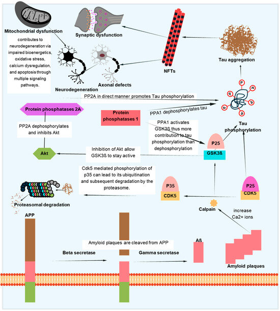 The aggregation of the Aβ-peptide causes synaptic dysfunction and neurodegeneration, as explained by the amyloid hypothesis [153]. Errors in the systems controlling the generation, accumulation, or removal of Aβ are the primary cause of AD. Aβ aggregation disrupts cell-to-cell communication and triggers the immune system, which leads to inflammation and ultimately the death of brain cells. Another pathogenic cause of AD is the buildup of tau, which is hyperphosphorylated by Aβ aggregation and results in NFTs [154]. Tau supports the brain’s neuronal architecture and several other important functions under normal circumstances [155]. But, in pathological conditions, tau becomes hyperphosphorylated and clumps together to form fibrils called neurofibrillary tangles. Neurotoxicity and neuronal degeneration result from the buildup of aberrant tau and tangles in neurons [33,156]. Tau phosphorylation affects not just the production of NFTs but also tau’s capacity to bind microtubules, which affects neuronal functions like mitochondrial respiration and axonal transport [157,158,159]. Neuronal cell death results from tau hyperphosphorylation-induced microtubule depolymerization, self-aggregation, and separation [160]. Figure 5 depicts one of several mechanistic pathways through which Aβ accumulation promotes tau pathology in AD. Increased intracellular calcium levels brought on by the deposition of Aβ peptides, especially in oligomeric forms, activate the calcium-dependent protease calpain. A prolonged and hyperactive CDK5/p25 complex is created when calpain cleaves the CDK5 activator p35 into p25. In addition to the contributions of GSK3β and DYRK1A, this abnormal kinase activity causes tau to become excessively phosphorylated. After undergoing conformational changes, hyperphosphorylated tau separates from microtubules, clumps together to form paired helical filaments, and finally forms NFTs. This pathogenic cascade has a role in the death and the malfunctioning of neurons. Abnormal protein aggregation, mitochondrial dysfunction, decreased neurotransmitter production, inflammation, and oxidative stress all contribute to the entire process. Although Figure 5 focuses on one such process, tau pathology in AD is linked to Aβ buildup through a number of overlapping mechanisms, as discussed in [161,162].