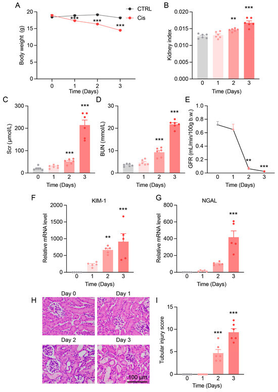 Cis-AKI mice show progressive decline in kidney function. (A,B) Body weight and kidney index (kidney weight/body weight) of mice at different time points post-cisplatin injection. n = 6. (C,D) Changes in Scr and BUN levels over time. n = 6. (E) GFR in Cis-AKI mice. n = 3–10. (F,G) Relative mRNA expression levels of KIM-1 and NGAL in the kidney cortex of Cis-AKI mice. n = 5. (H) H&E staining of mouse kidney cortex, scale bar = 100 µm. (I) Quantification of tubular injury score in mouse kidney sections. n = 6. Data are presented as means ± SEM. ** p < 0.01 and *** p < 0.001 vs. day 0.