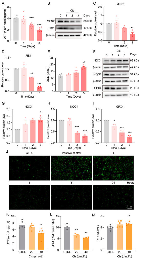 Cis-AKI mice and HK-2 cells exhibit mitochondrial dynamic imbalance and redox homeostasis disruption. (A) Changes in ATP levels in the renal cortex of Cis-AKI mice. n = 6. (B) Representative Western blot of fusion and fission proteins MFN2 and FIS1 in mouse kidneys. (C,D) Relative protein expression levels of MFN2 and FIS1 in mouse kidneys. n = 4. (E) Changes in serum XOD levels in Cis-AKI mice. n = 4. (F) Representative Western blot of antioxidant and oxidase enzymes NOX4, NQO1, and GPX4 in mouse kidneys. (G–I) Relative protein expression levels of NOX4, NQO1, and GPX4 in mouse kidneys. n = 3. Data are presented as means ± SEM. * p < 0.05, ** p < 0.01 and *** p < 0.001 vs. day 0. (J) ROS staining (green) in HK-2 cells after treatment with 40 μmol/L cisplatin for different time periods, scale bar = 1 mm. (K) Intracellular ATP levels in HK-2 cells after 24-hour treatment with varying concentrations of cisplatin. n = 5. (L) Ratio of JC-1 aggregates to JC-1 monomers in HK-2 cells after 24-hour treatment with different concentrations of cisplatin. n = 3. (M) XOD levels in HK-2 cells following 24-hour exposure to various concentrations of cisplatin. n = 6. Data are presented as means ± SEM. * p < 0.05 and ** p < 0.01 vs. CTRL.