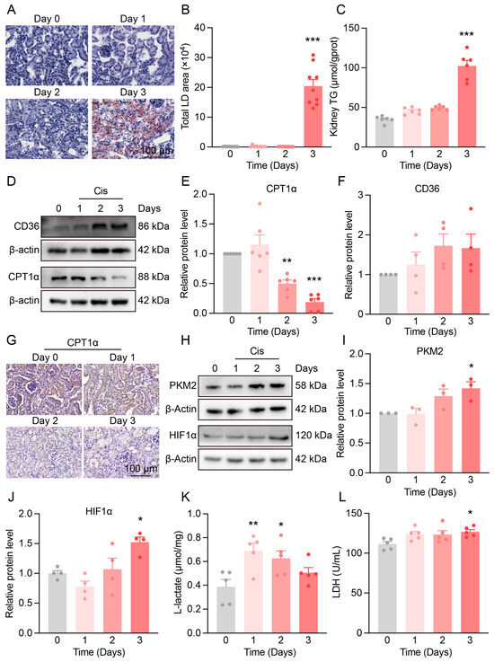 Metabolic reprogramming in the kidneys of Cis-AKI mice. (A) Representative Oil Red O staining images of kidney cortex in Cis-AKI mice, scale bar = 100 µm. (B) Quantification of lipid droplet area from Oil Red O staining. n = 9. (C) Triglyceride (TG) levels in the kidney cortex of Cis-AKI mice. n = 6. (D) Representative Western blot of CD36 and CPT1α expression in mouse kidneys. (E,F) Relative protein expression levels of CPT1α (n = 6) and CD36 (n = 4) in mouse kidneys. (G) Representative immunohistochemistry images of CPT1α in the kidney cortex of mice, scale bar = 100 µm. (H) Representative Western blot of PKM2 and HIF-1α expression in mouse kidneys. (I,J) Relative protein expression levels of PKM2 (n = 3) and HIF-1α (n = 4) in mouse kidneys. (K) Lactate levels in the kidneys of mice. n = 5. (L) L-lactate dehydrogenase levels in the serum of mice. n = 5. Data are presented as means ± SEM. * p < 0.05, ** p < 0.01 and *** p < 0.001 vs. day 0.