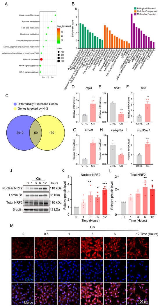 Changes in NRF2 expression and localization after cisplatin treatment in vivo and in vitro. (A) Bubble plot of KEGG pathway analysis for differentially expressed genes. (B) GO enrichment analysis of differentially expressed genes, with green representing biological process (BP), orange representing cellular component (CC), and purple representing molecular function (MF). (C) Venn diagram showing the overlap between differentially expressed genes and NRF2 downstream target genes. (D–I) Relative expression levels of NRF2 downstream genes Nqo1, Sod3, Gclc, Txnrd1, Ppargc1a, and Hsp90aa1 from RNA sequencing data. n = 4. Data are presented as means ± SEM. ** p < 0.01 and *** p < 0.001 vs. CTRL. (J) Representative Western blot showing total and nuclear NRF2 protein levels in the kidneys of Cis-AKI mice at early time points (1, 3, 6, and 12 h) after cisplatin treatment. (K,L) Quantification of nuclear (n = 4) and total (n = 3) NRF2 protein levels in the kidneys of Cis-AKI mice at early time points after cisplatin treatment. (M) Immunofluorescence images of NRF2 (red) in HK-2 cells treated with cisplatin for different durations. Nuclei are stained with DAPI (blue), scale bar = 100 µm. Data are presented as means ± SEM. * p < 0.05, ** p < 0.01, and *** p < 0.001 vs. hour 0.