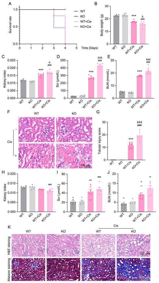 Renal function and structural changes in Nfe2l2 gene knockout mice in AKI and CKD models. (A) Survival rate of WT and Nfe2l2 gene KO mice after cisplatin administration. (B,C) Body weight (n = 7) and kidney index (kidney weight/body weight, n = 6) of different genotypes at day 3 after cisplatin administration. (D,E) Scr (n = 6) and BUN (n = 8) levels in different genotypes at day 3 after cisplatin administration. (F,G) Representative H&E staining images and tubular injury scores of different genotypes at day 3 after cisplatin administration, scale bar = 100 µm. n = 9. (H–J) Changes in kidney index, Scr, and BUN levels in KO and WT mice after 4 weeks of cisplatin treatment in the Cis-CKD model. n = 6. (K) Representative H&E and Masson’s trichrome staining images of KO and WT mice after 4 weeks of cisplatin treatment in the Cis-CKD model, scale bar = 100 µm. Data are presented as means ± SEM. * p < 0.05, ** p < 0.01 and *** p < 0.001 vs. WT group. # p < 0.05 and ### p < 0.001 vs. KO group. & p < 0.05 and &&& p < 0.001 vs. WT + Cis group.