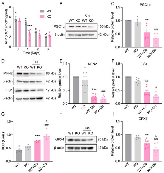 The impact of Nfe2l2 gene knockout on cisplatin-induced mitochondrial dysfunction. (A) ATP levels in the renal cortex of WT and KO mice at different time points (1, 2, 3 days) after cisplatin administration. n = 4. (B) Representative Western blot images of PGC1α in the kidneys of different genotype mice after cisplatin treatment. (C) Relative protein expression levels of PGC1α. n = 5. (D) Representative Western blot images of MFN2 and FIS1 in the kidneys of different genotype mice after cisplatin treatment. (E,F) Relative protein expression levels of MFN2 and FIS1. n = 7. (G) Serum XOD levels in different genotype mice after cisplatin treatment. n = 6. (H) Representative Western blot images of GPX4 in the kidneys of different genotype mice after cisplatin treatment. (I) Relative protein expression levels of GPX4. n = 6. Data are presented as means ± SEM. ** p < 0.01 and *** p < 0.001 vs. WT group. # p < 0.05 and ### p< 0.001 vs. KO group. & p < 0.05 vs. WT + Cis group.