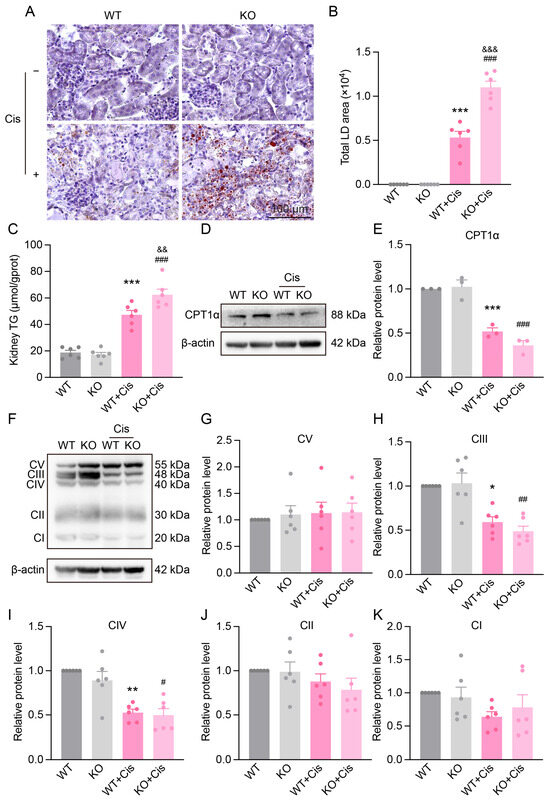 We also analyzed five key oxidative phosphorylation complexes (I–V). Cisplatin significantly reduced complex III and IV expressions in both WT and KO mice, while changes in complexes I, II, and V were mild. No significant difference was found between genotypes in the extent of reduction (Figure 7F–K).