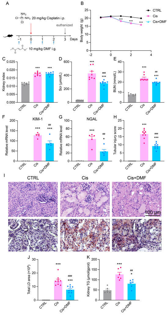 NRF2 activation alleviates renal injury and lipid deposition in Cis-AKI mice. (A) Schematic diagram of the DMF administration protocol. i.p.: intraperitoneal injection. i.g.: intragastric administration (B) Changes in mouse body weight during DMF administration. n = 8. (C) Kidney index (kidney weight/body weight) in Cis-AKI mice after DMF treatment. n = 8. (D,E) Scr and BUN levels in Cis-AKI mice after DMF treatment. n = 8. (F,G) Relative mRNA expression levels of KIM-1 and NGAL in the kidney cortex of Cis-AKI mice after DMF treatment. n = 5. (H) Quantification of tubular injury score in mouse kidney sections. n = 9. (I) Representative H&E staining and Oil Red O staining images of kidney cortex in Cis-AKI mice after DMF treatment, scale bar = 100 µm. (J) Quantification of lipid droplet area from Oil Red O staining. n = 9. (K) Triglyceride levels in the renal cortex of Cis-AKI mice after DMF treatment. n = 6. Data are presented as means ± SEM. * p < 0.05 and *** p < 0.001 vs. CTRL group. ## p< 0.01 and ### p< 0.001 vs. Cis group.
