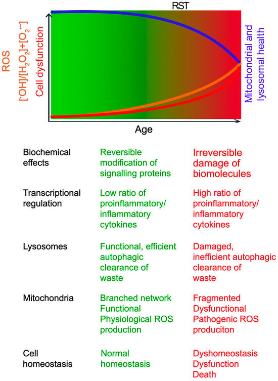 The Concept of Redox Stress Signalling Threshold (RST) in Aging and Disease. This schematic illustrates the concept of RST. The gradient represents the increase in oxidative stress with age. RST is a conceptual boundary marking the transition from oxidative eustress (green) to distress (red). As age progresses, ROS (Reactive Oxygen Species) levels (orange line) gradually rise, but any decline in mitochondrial and lysosomal functions (blue line) may not significantly impact cell function and viability (red line), until ROS production exceeds the RST. The age of onset varies based on genetic and environmental factors. Below the schematic, key biochemical and cellular changes associated with low (eustress) and high (distress) ROS levels are summarized.