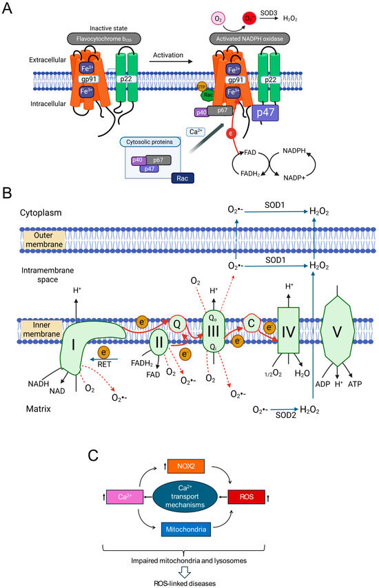 From a pathophysiological perspective, NOX2 (gp91phox) is particularly important. Unlike some isoforms, NOX2 activity requires multi-subunit complex assembly. In resting cells, the catalytic subunit (gp91phox) resides in the membrane, often with p22phox. Regulatory subunits (p40phox, p47phox, p67phox, and Rac GTPase) are cytoplasmic. Upon stimulation (e.g., increased intracellular Ca2+), these cytosolic subunits translocate and assemble with the core, forming the active enzyme. Activated NOX2 typically releases O2•− extracellularly. Extracellular SOD3 converts this to H2O2, which can enter the cytoplasm via aquaporins or diffusion [72,73,74,75]. While crucial for phagocytic host defence [76], accumulating evidence implicates NOX2-derived ROS in NCD pathogenesis, including inflammation, metabolic disorders, cardiovascular diseases, and neurodegeneration [72,73,74,77,78].