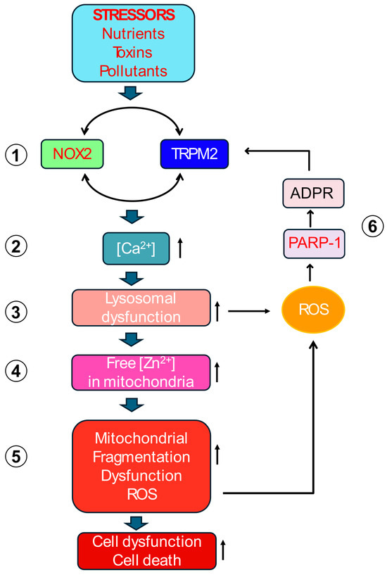 This mechanism integrates signalling molecules (TRPM2, NOX2, Ca2+, Zn2+, ADPR, ROS itself) and organelles (plasma membrane, lysosomes, mitochondria and nucleus) implicated in RIRP into a coherent pathway. It proposes a “circular domino effect” (Figure 4) where an initial stressor triggers a cascade of cytotoxic Ca2+, Zn2+, ROS and ADPR signals relayed between the plasma membrane, lysosomes, mitochondria and the nucleus. During this relay, progressive damage of lysosomes, mitochondria and nuclei occurs, leading to cell dysfunction and or demise. This cycle provides a plausible mechanistic explanation for ROS amplification and organelle impairment, the hallmarks of most NCDs [134]. The subsequent sections dissect the key steps of this putative cycle in more detail, as this aspect has not been previously reviewed.