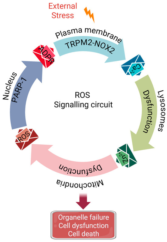 Thus, akin to a “circular domino effect,” the signalling circuit involves sequential, reciprocal lysosomal, mitochondrial and nuclear damage, initiated by plasma membrane Ca2+ signals (TRPM2-NOX2 co-activation) and propagated by Zn2+ (lysosome-generated), ROS (mitochondria-generated) and ADPR (nucleus-generated) signals culminating in pathogenic responses (Figure 3 and Figure 4). The cycle provides a plausible mechanistic explanation for how oxidative stress becomes amplified and self-sustaining, leading to progressive organelle damage and pathological outcomes in chronic disease settings.