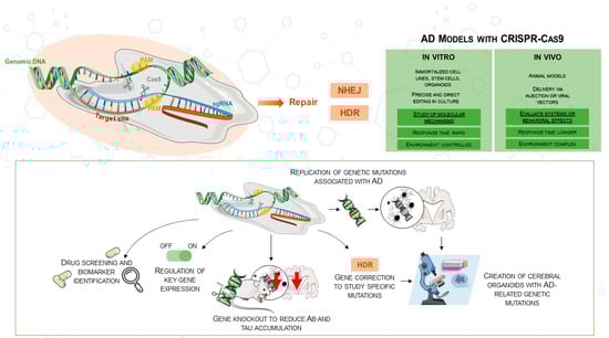 CRISPR/Cas9 technology has emerged as a versatile and promising tool for investigating and manipulating key genetic mechanisms involved in AD pathogenesis [29,30]. Precise genetic manipulation holds promise for improving patient outcomes [31]. CRISPR/Cas9 enables the creation of genetically modified models (in vivo and in vitro) to target key AD mechanisms, such as Aβ plaque deposition, Tau hyperphosphorylation, and neuroinflammation. For further details, refer to Table 1.