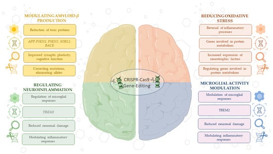 Overall, the results of these preclinical studies emphasize the importance of using CRISPR/Cas9 technology to modulate molecular and cellular processes, such as Aβ production and reduction of oxidative stress, underlying the pathogenesis of AD. This technology, alone or in combination with other treatments, could identify promising therapeutic strategies aimed at halting or even reversing AD progression (Figure 2).
