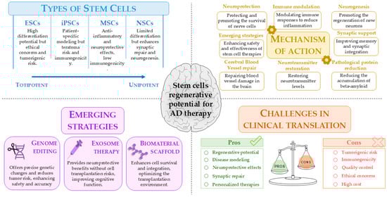 Stem cell-based approaches for AD therapy: opportunities and challenges. This figure summarizes the types of stem cells and their regenerative potential for AD treatment, highlighting mechanisms of action, emerging strategies such as genome editing and exosome therapy, and key clinical translation challenges. While stem cell therapies show promise in neuroprotection, neurogenesis, and synaptic repair, concerns remain regarding tumorigenicity, immunogenicity, and quality control. This image was created using the image bank of Servier Medical Art (Available online: http://smart.servier.com/; accessed on 30 May 2025) licensed under a Creative Commons Attribution 3.0 Unported License (available online: https://creativecommons.org/licenses/by/3.0/, accessed on 30 May 2025). AD: Alzheimer’s disease; ESCs: embryonic stem cells; iPSCs: induced pluripotent stem cells; MSCs: mesenchymal stem cells; NSCs: neural stem cells.