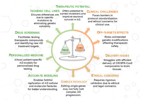 Currently, available data do not allow us to determine whether iPSCs or hESCs are intrinsically superior for the study of AD. However, iPSCs offer the key advantage of being derived directly from patients with specific genetic mutations, allowing the generation of cellular models that reproduce the genetic background of the disease [105]. Neurons and other brain cells generated from patient-derived cells provide a human-relevant context for studying AD, especially its familial or genetic forms [106]. Unaffected control iPSCs can serve as a basis for introducing mutations via genetic knock-in methods [107,108]. Moreover, iPSCs overcome the ethical issues linked to hESCs, as they are generated from adult somatic cells without involving embryos, facilitating the development of new therapeutic strategies. Recent evidence suggests that using CRISPR/Cas9 to introduce AD-associated mutations in stem cell-derived models enables researchers to study genetic variations more effectively, shedding light on the molecular mechanisms of AD [109]. Findings revealed that the combination of iPSCs and CRISPR/Cas9 is a promising approach for assessing pathological features typical of AD, including protein aggregation, oxidative stress, and neuronal death [110]. However, as we will see in the next chapter, several methodological limitations must be carefully considered. iPSCs, although offering a relevant human model, present challenges related to inter- and intra-lineage variability, epigenetic memory of the tissue of origin, and potential genomic alterations acquired in culture, including tumorigenesis. Two-dimensional models often do not reproduce complex phenotypes such as neurodegeneration or tau pathology, while more mature and physiologically relevant 3D organoids suffer from heterogeneity, lack of vascularization, and limited representation of cells such as microglia. Generation of specific neuronal subtypes or multicellular co-cultures also remains technically challenging and poorly standardized. With respect to genome editing, CRISPR/Cas9 carries inherent risks such as off-target effects, mosaicism, and DNA damage response. Efficient delivery of editing components into post-mitotic neurons remains a challenge, as does the generation of precise knock-in mutations. Furthermore, lengthy protocols, use of antibiotics and plasmids, and analytical biases in single-cell data further complicate the interpretation of results [see Section 5].
