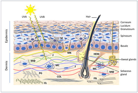 A diagram of the epidermis and dermis, showing the penetration of UVA (315–400 nm) and UVB (280–315 nm) and several cellular and intercellular components referred to in the text. Abbreviations: L: Langerhans cells; M: melanocyte; MK: Merkel cell; F: fibroblast; HEM: hair elevator muscle; Mϕ: macrophage; MC: mast cell; PG: proteoglycan; COL: collagen; EL: elastin; FN: fibronectin.