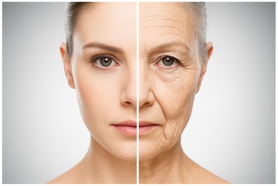 The process of skin aging is the result of a combination of intrinsic and extrinsic factors [,]. The process of intrinsic skin aging is associated with a number of factors that naturally change with age. Such factors include a reduction in cell proliferative capacity, a reduction in antioxidant capacity, and disturbances in metabolic homeostasis. Extrinsic skin aging is induced by environmental factors, including air and water pollution, but particularly chronic UV exposure in sun-exposed areas such as the face and neck.