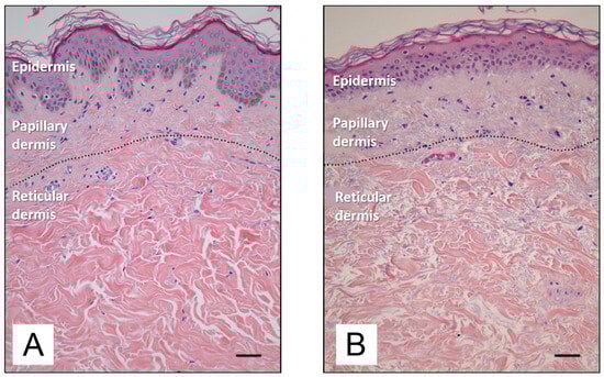 Histological features of young (A) and old (B) human skin []. Available via Creative Commons license BY 4.0. Scale bar: 50 mm.
