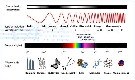 In humans, sunlight is beneficial for vision and for maintaining thermal homeostasis through infrared radiation. Moreover, UV light is of particular importance for synthesizing vitamin D, which has hormone-like functions, including the intestinal absorption of calcium and phosphate, and the renal reabsorption of calcium []. Furthermore, vitamin D plays a role in maintaining immune system equilibrium []. In addition to the aforementioned effects, UV radiation has been demonstrated to possess beneficial properties, including the ability to eradicate pathogenic microorganisms and facilitate the healing process in conditions such as psoriasis.