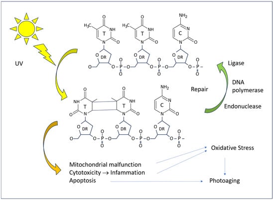 The pathogenic effects of excessive UV radiation manifest at the cellular and tissue levels through direct and indirect mechanisms. In the absence of repair, DNA damage results in a reduction in protein production, the initiation of apoptotic processes, and, in the event of survival, the introduction of mutations. Both types of UV rays have an excitatory effect on the DNA of skin cells, with a particular impact on pyrimidine bases at the molecular level (Figure 5). The most notorious form of damage is the formation of pyrimidine dimers (T-T thymine dimers, T-C thymine–cytosine dimers, and C-C cytosine–cytosine dimers) when two of such bases are adjacent in the chain of a single DNA strand. Such damage is a common occurrence in tissues exposed to sunlight. However, the vast majority of such lesions are repaired rapidly, with only a small proportion leading to pathological cell alterations.