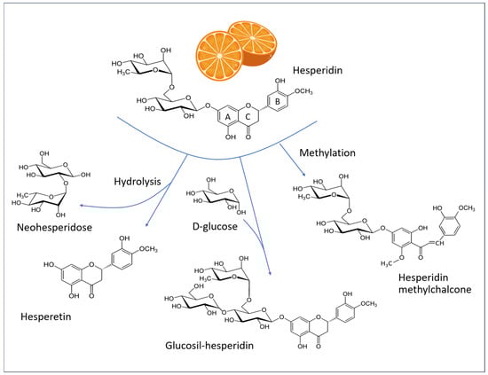 Hesperidin is defined structurally by an aglycone, known as “hesperetin”, which binds a 6-O-α-L-rhamnosyl-D-glucose moiety at position 7 via a glycosidic bond. Hesperetin is released in the gut by the bacterial flora, which in turn is influenced by the ingestion of hesperidin [,].