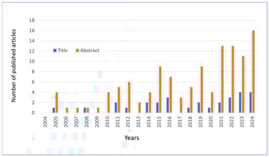In this review, articles on hesperidin and related molecules published in the last 20 years were searched using the PubMed platform, using the keywords “hesperidin” or “hesperetin” combined with “skin” and the year of publication. Following an initial screening, a total of 135 articles were identified as being of interest to the topic under review. The publication of these articles is distributed over time, as illustrated in Figure 8. In collecting the results, the articles that mentioned the two flavonoids in the title or in the abstract were calculated separately.