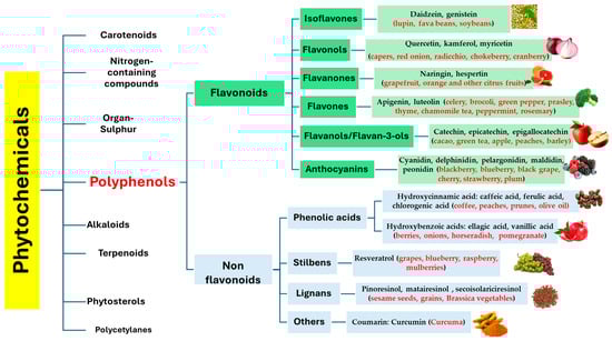 Chemically, phytochemicals are commonly categorized into major groups, including phenolics, carotenoids, alkaloids, nitrogen-containing compounds, and organosulfur compounds (Figure 1). Among these, phenolic compounds, also referred to as polyphenols, are the most extensively studied due to their wide distribution in plant foods and their broad spectrum of biological activities.