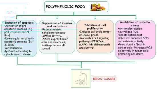 Several studies have shown a strong association between adherence to the MedDiet and a reduced incidence of various chronic diseases, including cardiovascular disease, type 2 diabetes, obesity, and certain cancers, particularly breast cancer. The protective role of this diet against breast cancer has been linked to its high content of dietary antioxidants, anti-inflammatory agents, and PPs, which act through multiple biological mechanisms including modulation of oxidative stress, hormone metabolism, and immune responses [].