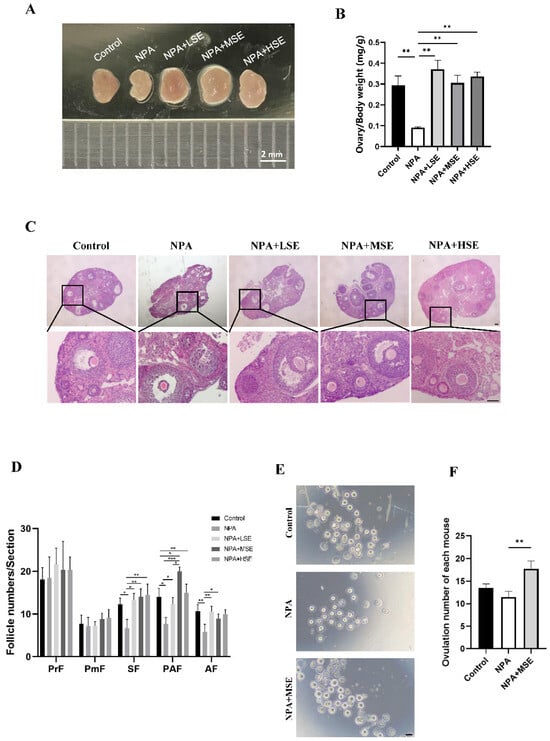 Total RNA was extracted from the ovaries and GCs in each group using a TRIzol Reagent (Vazyme, R401, Nanjing, Jiangsu, China). RNA purity was assessed with an ultraviolet-visible photometer (Shimadzu, Bio-Spec-nano, Kyoto, Japan). Briefly, 1 mL of the TRIzol Reagent and steel beads were added to the ovaries of each group, thoroughly ground in a high-throughput tissue grinder, and centrifuged at 12,000 rpm for 15 min at 4 °C. The aqueous phase was transferred to a fresh centrifuge tube, followed by the addition of an equal volume of ice-cold isopropanol. Following 10 min incubation at room temperature, the samples were centrifuged at 12,000× g for 15 min at 4 °C. The resultant RNA pellet was washed twice with 75% ethanol and subsequently dissolved in 30 μL of nuclease-free water. The RNA purity and concentration were quantified using a UV-Vis spectrophotometer (BioSpec-nano, Shimadzu, Kyoto, Japan). Subsequently, cDNA was synthesized with the HiScript II Q RT SuperMix for qPCR (Vazyme, R223, Nanjing, Jiangsu, China) following the manufacturer’s protocol. Real-time PCR was conducted using a ChamQ SYBR qPCR Master Mix (Vazyme, Q311-01, Nanjing, Jiangsu, China), as previously described []. Actb was set as the reference gene, and the fold change in gene expression was quantified using the comparative CT method. The primers utilized are detailed in Table S2.