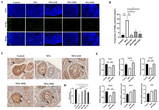 Given the essential roles of GCs in follicular growth and development, this study evaluated the proliferation and apoptosis of these cells in ovaries exposed to different concentrations of Swertiamarin. The TUNEL assay reveals that the proportion of apoptotic GCs in the ovaries of the NPA group was significantly greater than that observed in the Control group. In comparison to the NPA group, the proportions of apoptotic GCs in the NPA + LSE, NPA + MSE, and NPA + HSE groups were reduced by 87.8%, 67.2%, and 79.7%, respectively (Figure 2A,B). The proliferation of GCs was further validated through immunostaining for the cell proliferation marker proliferating cell nuclear antigen (PCNA) in the ovarian tissue sections. Compared to the NPA group, the proportion of PCNA-positive GCs in the NPA + LSE, NPA + MSE, and NPA + HSE groups exhibited increases of 38.2%, 55.0%, and 27.2%, respectively (Figure 2C,D). Furthermore, the mRNA expression levels of several critical genes involved in follicle development were evaluated. Although the expression levels of two oocyte-expressed genes, growth differentiation factor 9 (Gdf9) and bone morphogenetic protein 15 (Bmp15), did not exhibit significant differences between the NPA group and the NPA + MSE group. The expression levels of four GC-expressed genes—notch receptor 2 (Notch2), bone morphogenetic protein 4 (Bmp4), SMAD family member 4 (Smad4), and SMAD family member 5 (Smad5)—increased by 69.0%, 24.0%, 45.7%, 49.4%, respectively, in the NPA + MSE group compared to the NPA group (Figure 2E). Furthermore, considering that the majority of estrogen and a portion of progesterone are synthesized by GCs, the concentrations of estradiol and progesterone in the peripheral blood of mice subjected to different treatments were assessed. No significant differences were observed among the Control, NPA, and NPA + MSE groups (Figure S2). These findings indicate that the administration of Swertiamarin partially mitigated the impaired development and function of ovarian GCs in mice treated with 3-NPA.
