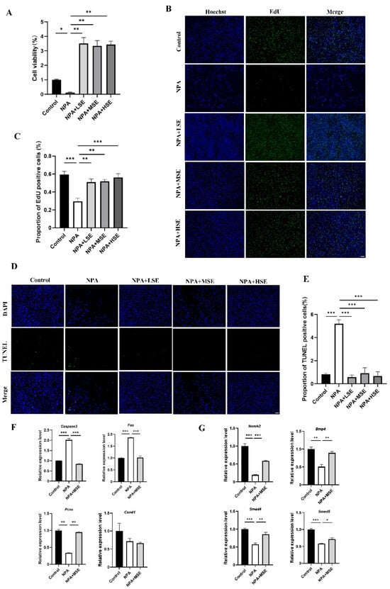 The impact of Swertiamarin on the proliferation of GCs under the treatment of 3-NPA was further validated by an in vitro model. The effects of different concentrations of Swertiamarin on the viability of GCs were first assessed, and no significant changes in viability were observed among the Control, LSE, MSE, and HSE groups (Figure S3). The results of the Cell Counting Kit-8 (CCK-8) assay and ROS level detection indicate that a concentration of 10 mM of 3-NPA significantly reduced cell viability and elevated the level of oxidative stress when compared to the Control group (Figure S4). In comparison to the 10 mM 3-NPA treatment alone (NPA group), the viabilities of GCs treated with 10 μg/mL (NPA + LSE group), 25 μg/mL (NPA + MSE group), and 50 μg/mL (NPA + HSE group) of Swertiamarin in combination with 10 mM of 3-NPA was significantly increased by at least more than 27-fold (Figure 3A). The TUNEL assay and EdU staining provided further evidence that Swertiamarin administration effectively alleviated apoptosis and improved the proliferation of GCs induced by 3-NPA (Figure 3B–E). Several genes associated with cell proliferation and apoptosis, including Pcna, cyclin D1 (Ccnd1), Caspase3, and the Fas cell surface death receptor (Fas), were analyzed. The mRNA levels of the pro-apoptotic genes Caspase3 and Fas were found to decrease by 58.4% and 45.5%, respectively, in the NPA + MSE group compared to the NPA group. Conversely, the abundance of the proliferation-related gene PCNA increased by 178.1% in the NPA group relative to the NPA + MSE group (Figure 3F). Moreover, although the levels of estradiol and progesterone in the culture medium of GCs remained unchanged following different treatments (Figure S5), the expression levels of four genes associated with follicle development—Notch2, Bmp4, Smad4, and Smad5—increased by 202.0%, 76.7%, 48.8%, and 22.4%, respectively, in the NPA + MSE group compared to the NPA group (Figure 3G). These findings demonstrate that Swertiamarin ameliorated the impaired development and function of GCs induced by 3-NPA in vitro.