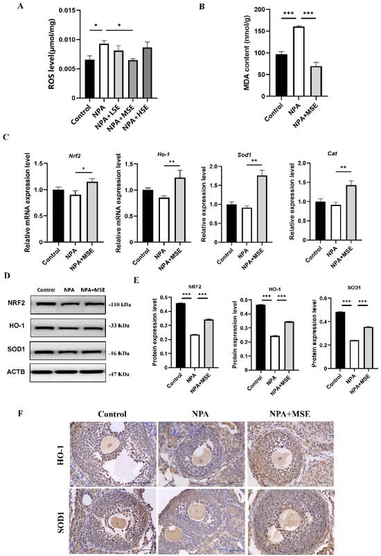 Considering that 3-NPA induces significant oxidative stress in mouse ovaries and that Swertiamarin is recognized as a potent antioxidant, we evaluated the levels of ROS in mouse ovaries following combined treatment with 3-NPA and Swertiamarin. Compared to the NPA group, ROS levels in the NPA + MSE group exhibited a decrease of 30.0% (Figure 4A). Additionally, malondialdehyde (MDA), a biomarker indicative of lipid peroxidation and oxidative stress, was significantly elevated in the NPA group relative to the Control group but exhibited a decrease in the NPA + MSE group (Figure 4B). The NRF2/HO-1 signaling pathway plays a crucial role in mediating cellular and tissue responses to oxidative stress. We assessed the mRNA expression levels of several components of the NRF2/HO-1 pathway, including nuclear factor erythroid 2-related factor 2 (Nrf2), heme oxygenase 1 (Ho-1), superoxide dismutase 1 (Sod1), and catalase (Cat), in the ovaries of the different experimental groups. In the NPA + MSE group, the expression levels of Nrf2, Ho-1, Sod1, and Cat increased by 27.7%, 44.8%, 92.2%, and 55.6%, respectively, when compared to the NPA group (Figure 4C). Correspondingly, the protein expression of NRF2, HO-1, and SOD1 exhibited a similar trend (Figure 4D,E). Additionally, the immunostaining results in the ovarian sections reveal that HO-1 and SOD1 displayed strong positive signals in GCs from both the Control and NPA + MSE groups, whereas expression was weak in the NPA group (Figure 4F).