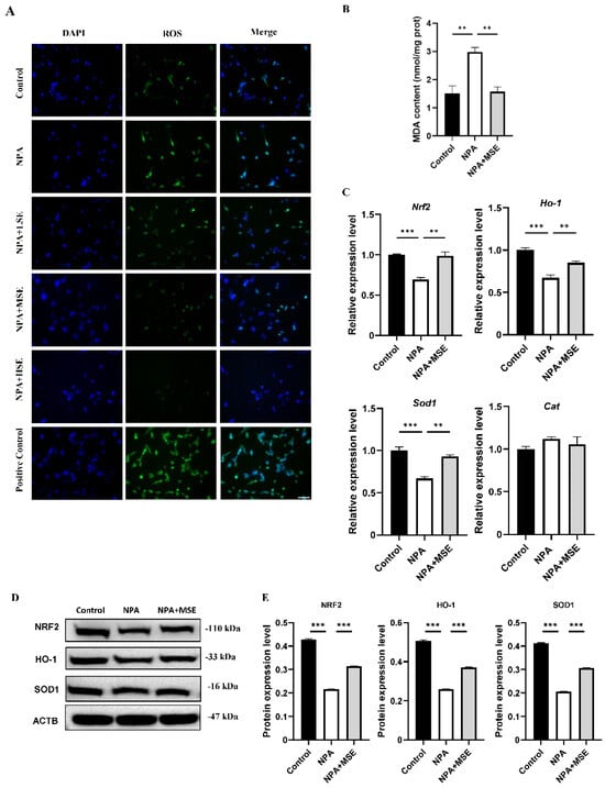 Swertiamarin treatment reduced oxidative stress and improved NRF2/HO-1 pathway in 3-NPA-treated mice GCs. (A) ROS level detection in mice GCs with different treatments. Bar: 50 μm (n = 3). (B) Detection of MDA levels in mice GCs (n = 3). (C) Relative mRNA levels of antioxidant genes Nrf2, Ho-1, Sod1, and Cat in GCs of Control, NPA, and NPA + MSE groups (n = 3). (D) Protein expressions of antioxidant proteins NRF2, HO-1, and SOD1 in ovaries of Control, NPA, and NPA + MSE groups (n = 3). (E) Optical density analysis of (D). ** p < 0.01. and *** p < 0.001; one-way ANOVA (with Tukey’s multiple comparisons test as the post-hoc test).