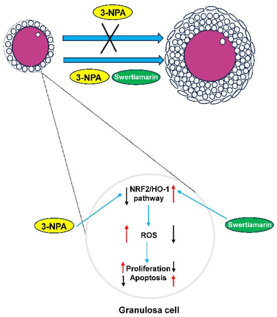A schematic diagram of the proposed mechanisms by which Swertiamarin ameliorates 3-NPA-induced defective follicle development in mouse granulosa cells.