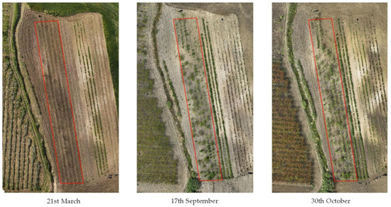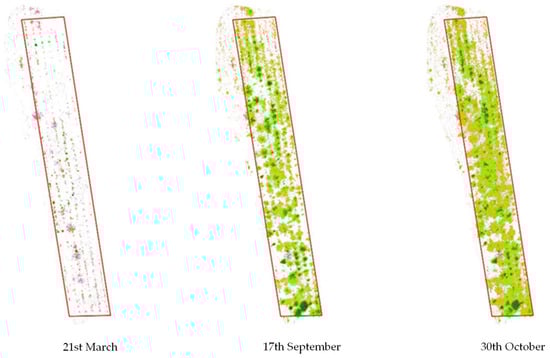 NDVI values were calculated during three main periods: March, September, and October, to identify areas of vegetation. Zonal statistics in QGIS facilitated the calculation of surface areas corresponding to different NDVI classes, enabling precise management. The spectral data also enabled the creation of false-colour images, which highlighted vegetation and provided insights into the health and vigour of M. oleifera. Typically, NDVI values ranged from 0.7 to 0.9, indicating robust growth. On 21st March, the average NDVI values were 0.3, 89% of the land surface was bare, and M. oleifera plants were lacking vegetation. On 17th September, more than half of the surface (54%) showed healthy vegetation with good vigour [46]. By 30th October, 67% of the surface showed a good level of vegetative vigour (Figure 2).