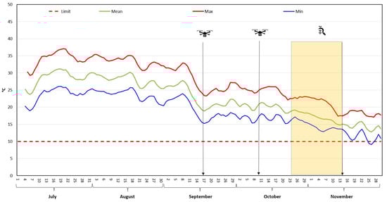 Overall, UAV-based multispectral imaging, coupled with advanced data processing tools, provides valuable insights for optimizing crop management and decision-making in precision farming, particularly for MAPs like M. oleifera [47]. The optimal harvest time was determined when mean NDVI values were 0.85 and the mean minimum temperature was above 10 °C, the threshold below which M. oleifera plants begin to lose their leaves and experience a decrease in vegetative vigour [48]. This period was between 30th October and 14th November 2024 (Figure 3).