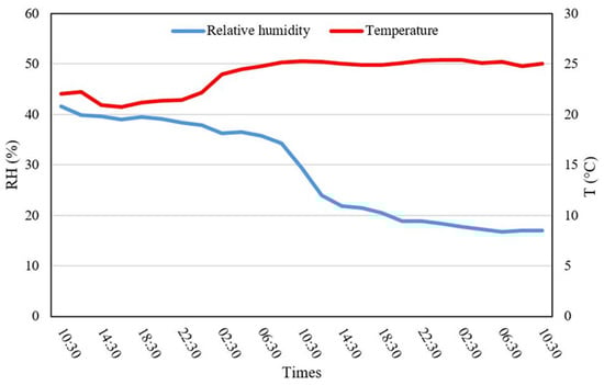 The drying process began at 10:30 a.m. and concluded after two days, during which the relative humidity dropped from 41 to 9%. Temperature fluctuations were monitored, and the data were transmitted via Wi-Fi to a ThingSpeak account for real-time tracking. The WSN system enabled the precise monitoring of the moisture content and drying rates for M. oleifera, providing valuable decision support throughout the drying process (Figure 4).