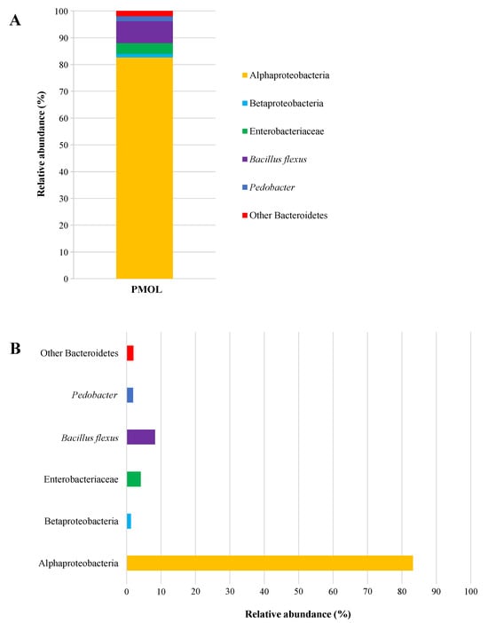 In this study, DNA-based Illumina technology was employed to thoroughly examine the microbiota of PMOLs. This culture-independent microbiological approach allows for the evaluation of the complete bacterial composition in both processed and unprocessed foods [74], including the identification of viable but non-cultivable and/or dormant bacterial communities [75]. The results reported in Figure 5A include the OTUs with a Relative Abundance RA ≥ 0.1%, which are classified as abundant bacterial communities [76]. In particular, six taxonomic groups were identified at RA ≥ 0.1%, divided into one phylum, two classes, one family, one genus, and one species (Figure 5B).