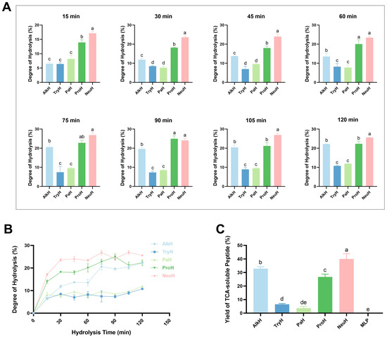 Degree of hydrolysis of mulberry leaf protein (MLP). (A) Degree of hydrolysis of MLP over time under different protease hydrolysis conditions; (B) hydrolysis degree curve within 2 h; (C) yields of TCA-soluble peptide ratio of MLP hydrolysate. Notes: AlkH, TryH, PaH, ProH, and NeuH represent alkaline protease, trypsin hydrolysate, papain hydrolysate, protamex hydrolysate, and neutral protease hydrolysate, respectively; different lowercase letters (a–e) indicate statistically significant differences between hydrolysates (p ≤ 0.05); same lowercase letters indicate no statistically significant differences (p > 0.05).