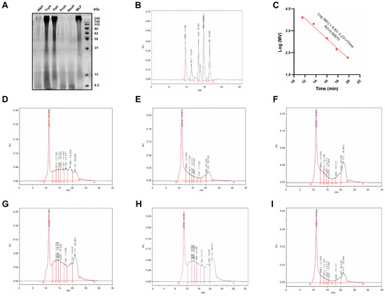 Molecular weight distribution of different hydrolysates. (A) SDS−PAGE electrophoresis of MLP and its hydrolysate; (B,C) scale curve for the determination of molecular weight distribution; (D–I) high performance gel permeation chromatogram of MLP, AlkH, TryH, PaH, ProH, and NeuH. Notes: AlkH, TryH, PaH, ProH, and NeuH represent alkaline protease, trypsin hydrolysate, papain hydrolysate, protamex hydrolysate, and neutral protease hydrolysate, respectively; MW means molecular weight; the “number-number” in (B,D–I) means “molecular weight (Da)-retention time (min)”.