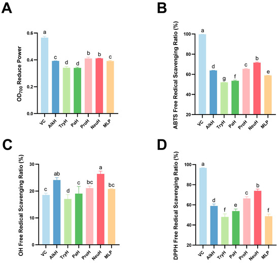 Antioxidant activity of different hydrolysates. (A) OD700 reduced power of different hydrolysates; (B) ABTS free radical scavenging ratio of different hydrolysates; (C) OH free radical scavenging ratio of different hydrolysates; (D) DPPH free radical scavenging ratio of different hydrolysates. Notes: VC, AlkH, TryH, PaH, ProH, and NeuH represent vitamin C alkaline protease, trypsin hydrolysate, papain hydrolysate, protamex hydrolysate, and neutral protease hydrolysate, respectively; different lowercase letters (a–g) indicate statistically significant differences between hydrolysates (p ≤ 0.05); same lowercase letters indicate no statistically significant differences (p > 0.05).
