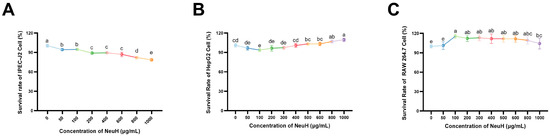 Effects of different concentration of NeuH on cell (n = 6). (A) Survival rate of IPEC-J2 cell; (B) survival rate of HepG2 cell; (C) survival rate of RAW264.7 cell. Notes: NeuH represents neutral protease hydrolysate; different lowercase letters (a–e) indicate statistically significant differences between different concentrations (p ≤ 0.05); same lowercase letters indicate no statistically significant differences (p > 0.05).